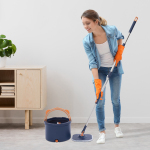 Волокнисті швабри можуть ефективно вбирати бруд, воду та пил. Крім того, продукт забезпечує розділення стічних вод шляхом перекачування води в одному напрямку та скидання всієї брудної води за межі бочки (зона стічних вод). Відро має власні зуби гребінця, щоб зішкребти бруд і очистити волосся, а високошвидкісна обертова турбіна забезпечує відцентровий дренаж, що дозволяє швидко використовувати його.